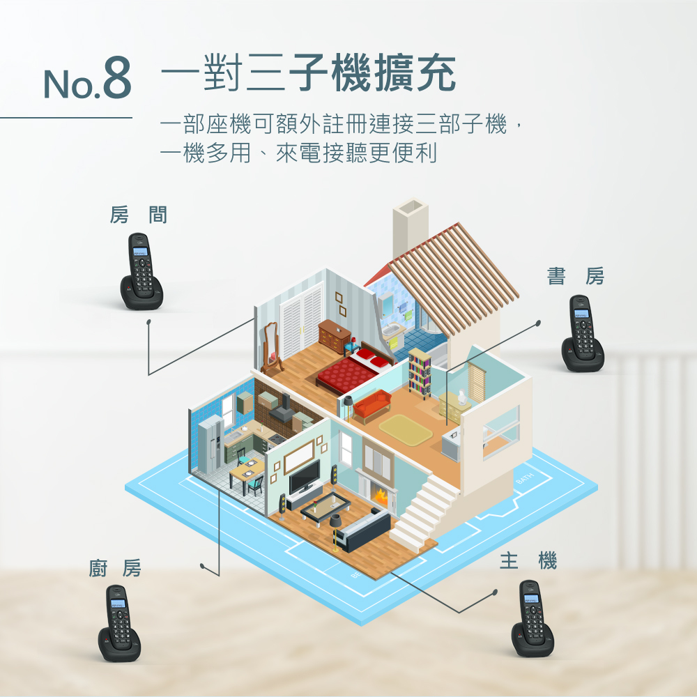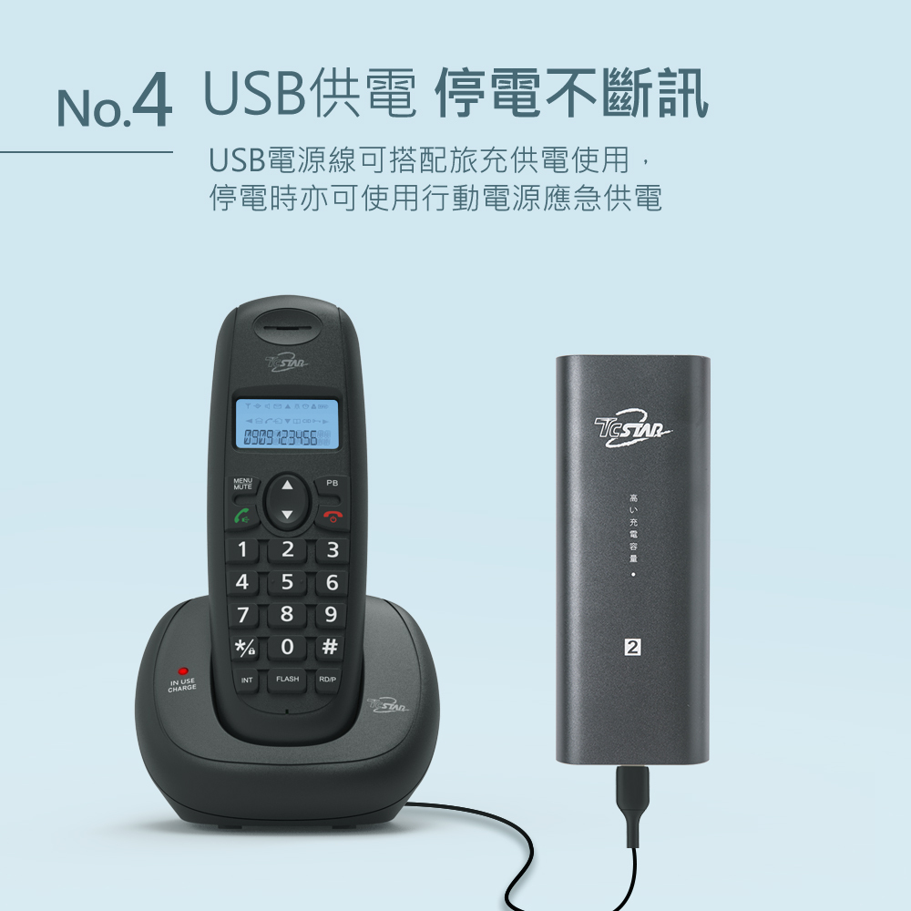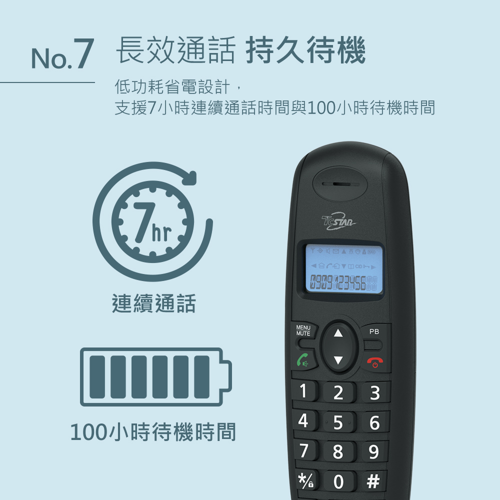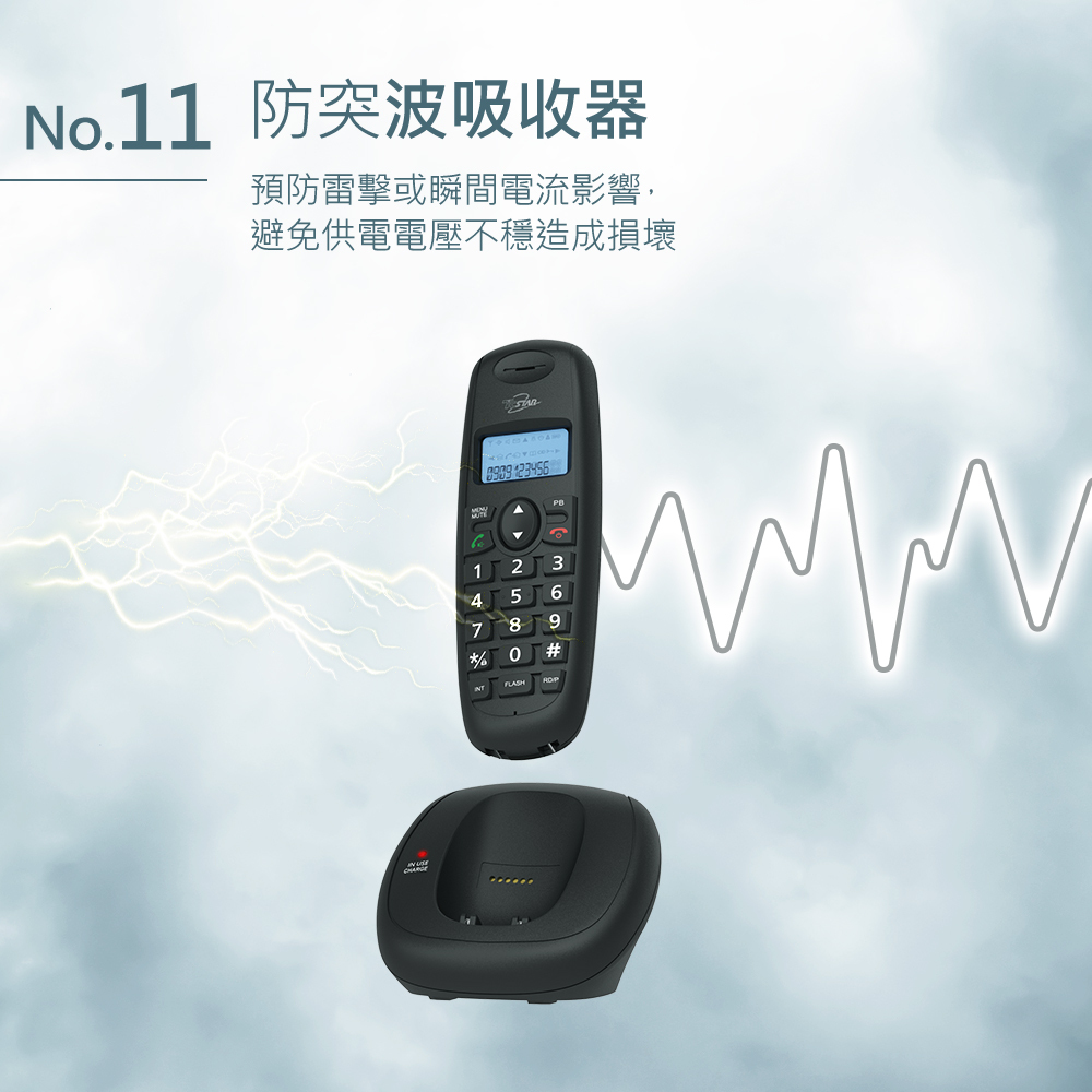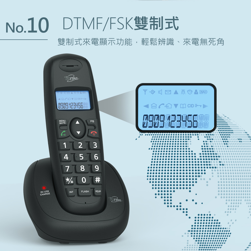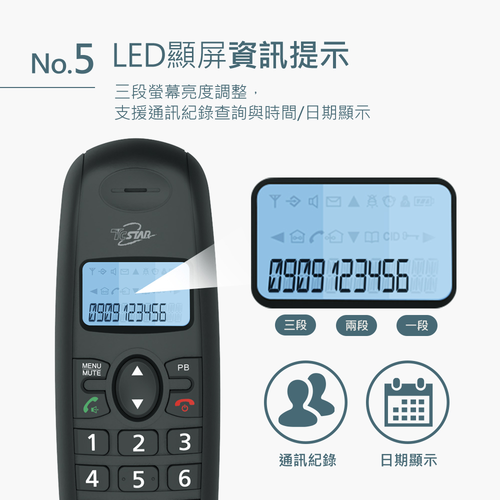功能說明:暫切功能/末碼重撥/來去電查詢/免持功能/按鍵鎖/鬧鐘設定/三方通話